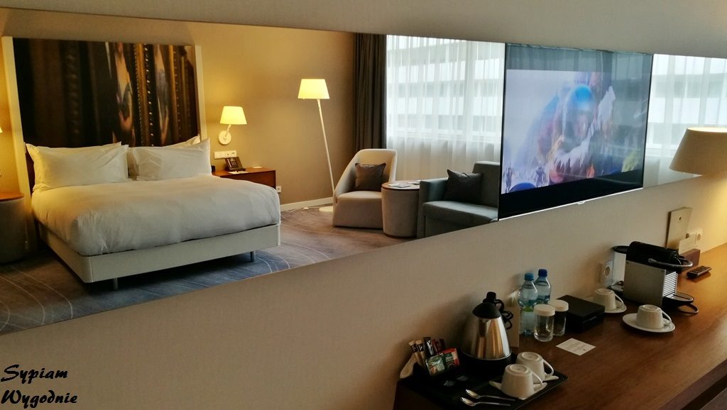 Pokój King Guest Room składał się z wygodnego dwuosobowego łóżka z ciekawym zagłówkiem, fotela z stolikiem kawowym. Oprócz tego znalazł się tu także telewizor z szerokim pakietem kanałów telewizyjnych (włącznie z HBO i przydatnym serwisem hotelowym), minibarek, zestaw do parzenia kawy i herbaty oraz licznych szuflad czy szafy. Całe pomieszczenie zostało urządzone w przyjemnych barwach. Czułem tam domową atmosferę oraz przestrzeń. Klasy dodawały lustra znajdujące się po obu stronach telewizora oraz kształt komody oraz lamp. Warto zaznaczyć, że w hotelu nie ma możliwości otwarcia okna i jesteśmy zdatni jedynie na klimatyzację. Tu działała bez zarzutu i nie przeszkadzała w komfortowym śnie.