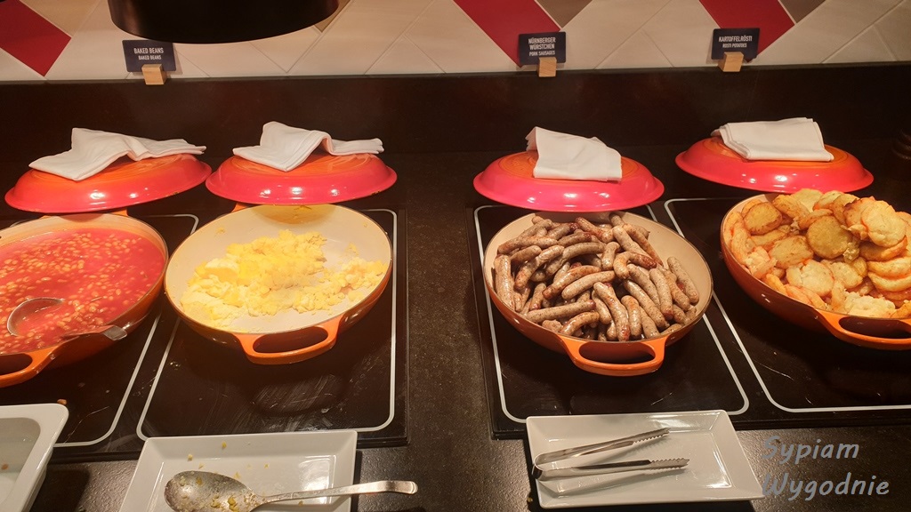 W Hampton by Hilton Berlin East Side Gallery Goście mają do wyboru klasyczne dania na ciepło, tj. jajka na twardo, kiełbaski, jajecznica, bekon, placki ziemniaczane podawane w dużych brytfannach. Zauważyłem, że na ladzie obsługa stawia dodatkowe pojemniki, które są otwierane, gdy dana potrawa się już skończy. Ciekawy sposób na sprawne uzupełnianie braków przy sporym ruchu.