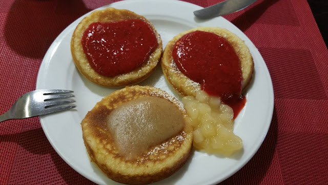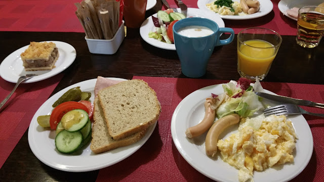 Cena noclegu obejmuje również śniadania, które są skromniejsze niż w trzy-gwiazdkowych Mercurach. Trzeba przyznać, że są smaczne i mamy też do wyboru dania ciepłe jak i na zimno, w tym domową sałatkę jarzynową. Miłym akcentem jest 'strefa’ poświęcona jabłkom, w ramach której oferowana jest szarlotka, kompot jabłkowy (był tylko pierwszego dnia), czy naleśniki z musem jabłkowym.