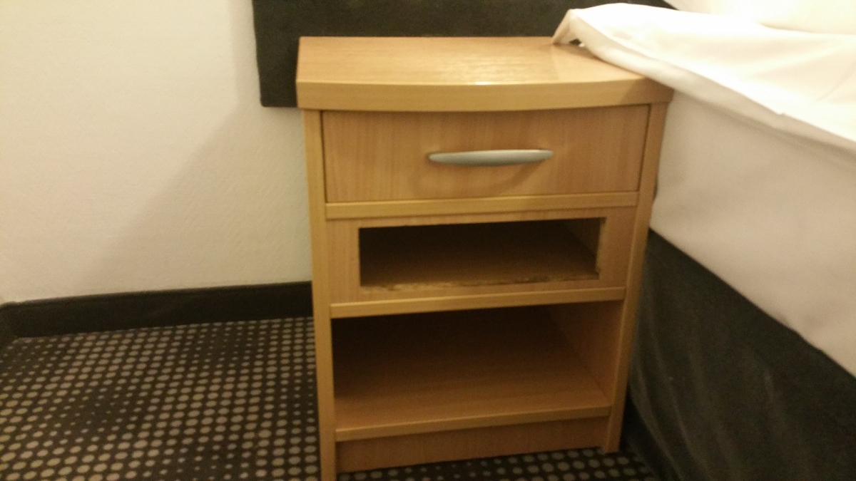 Przydzielony został pokój na siódmym piętrze, który wg zapewnień obsługi jest świeżo po remoncie, więc dziarskim krokiem udaliśmy się do niego. Pierwsze wrażenie, jak najbardziej pozytywne. Mały, skromny, ładny pokój z lekko przybrudzonymi ścianami, do tego odświeżona przyjemna malutka łazienka, ale diabeł tkwi w szczegółach. Podnosząc głowę w łazience ujrzymy pęknięty kaseton. Natomiast w pokoju chcąc schylić się do nocnej szafki zauważymy, że coś jest nie tak. Zostało z niej wyjęte radio, a boki nie zostały wyszlifowane. Ogólnie szafka wyglądała, jakby czekała na wyrzucenie. Podchodząc do krzesła zauważyłem kilka plam na wykładzinie, prawdopodobnie od farby i odklejającą się tapetę. Chciałem również sprawdzić menu, które okazało się także brudne… Gdyby doba w takich warunkach kosztowała conajmniej połowę jak nie 2/3 mniej tego co zapłaciłem to byłoby to do zaakceptowania. Co na to wszystko hotel? O tym za chwilę. Warto również zaznaczyć, że w pokoju nie ma lodówki czy też zestawu do herbaty i kawy, ale to nam rekompensuje dostępny 24h express w lobby.