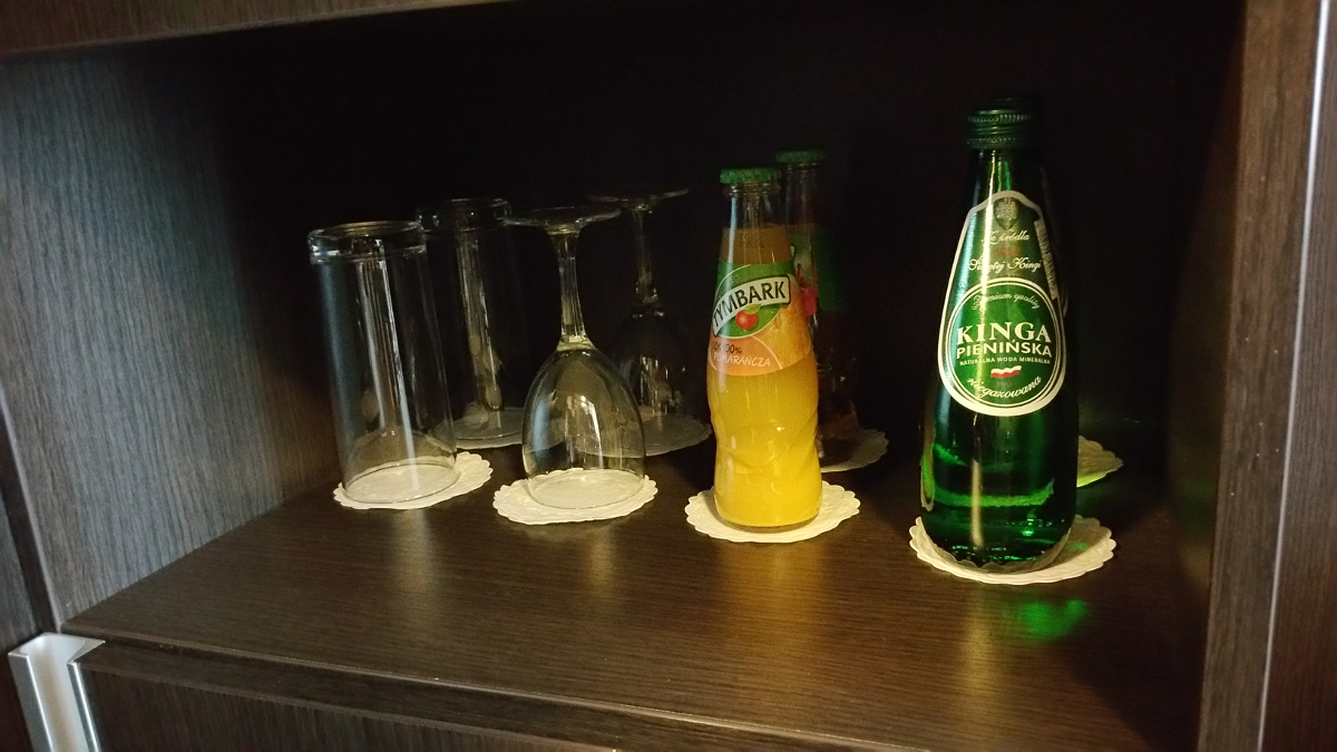 Sam pokój… bardzo fajny, świeżo, ładnie, czysto, przestronnie i do tego ten trójkątny parapet, a jak się wychylimy to widać Pałac. Dalsze pokoje mają lepszy widok 🙂 W pokoju do dyspozycji było żelazko i deska do prasowania, do tego w ramach pobytu można było bezpłatnie wyprać jedną sztukę odzieży (nie testowałem). Oprócz wody dla Gości były bezpłatnie dołączone soki oraz zaproszenie na lampkę wina z przekąską. Do tego indywidualnie sterowana klimatyzacja, Canal + i można cały weekend przesiedzieć w pokoju.