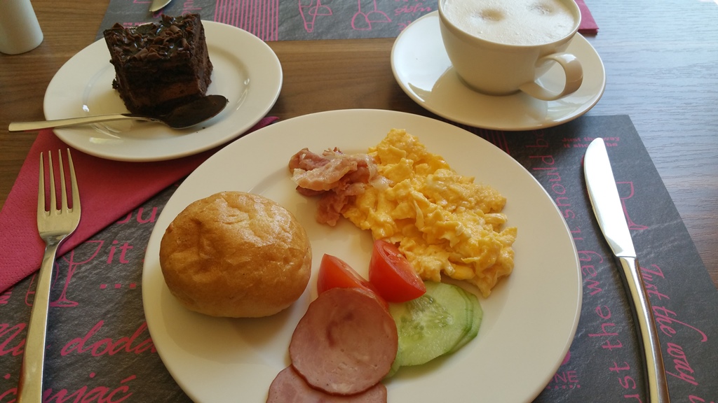 Przejdźmy teraz do restauracji. Korzystaliśmy z niej podczas śniadań i trzeba przyznać, że trzymały wysoki poziom. Dania były zróżnicowane – drugiego dnia dostępne były nawet pierogi. Nie próbowałem ich, więc nie powiem jakie to były – czy ruskie/z mięsem itd. Moją uwagę zwróciło bardzo dobre ciasto, którym zajadałem się przez dwa dni oraz smaczny omlet, na którego trochę musieliśmy poczekać, ponieważ… skończyły się jajka. Takie jaja! J